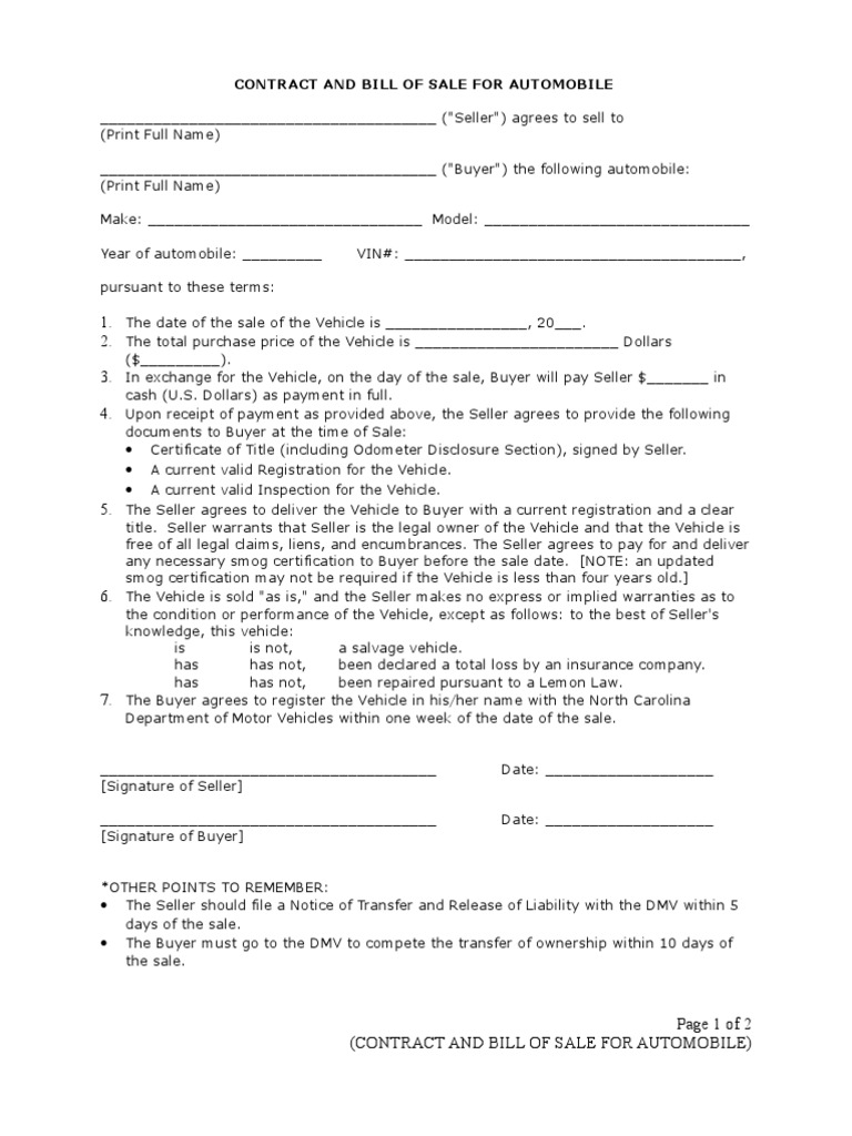 Car Bill Of Sale Nc Template