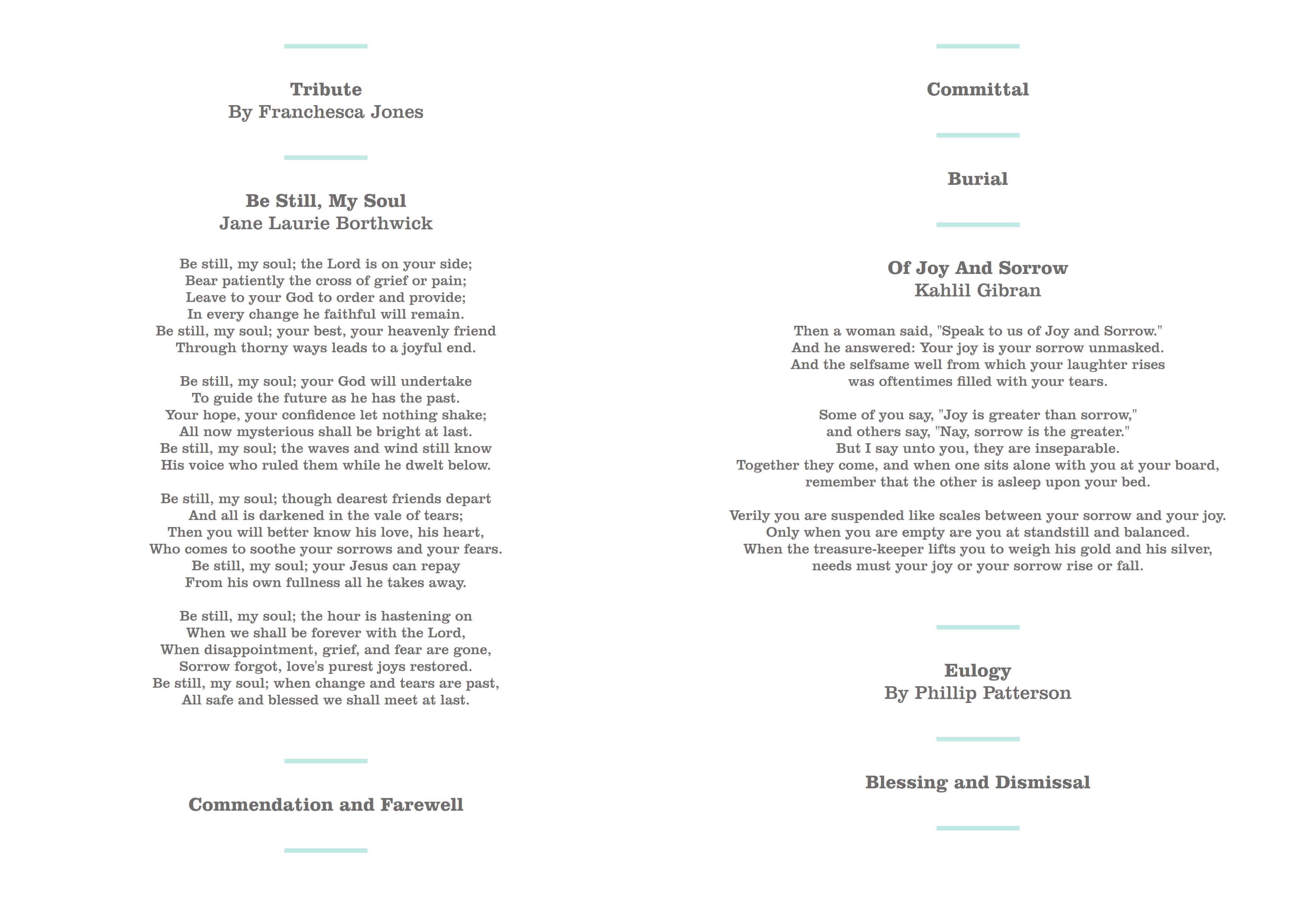 Editable funeral order of service template. A funeral order of service is a very personal and unique event for your loved one a funeral order of service provides a schedule of the ceremony and handed out to. Or select the adobe pdf option to download a blank template to design over the top of. Easily editable printable. The design of this template depicts a peaceful layout.