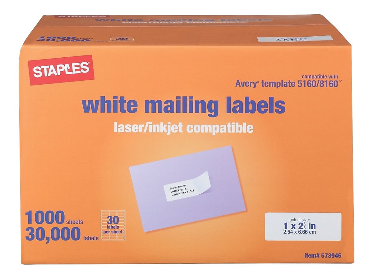 Read reviews to learn about the top rated avery easy peel clear glossy laser inkjet address labels 1 x 2 5 8 750 pack 7660. Staples 1 2 x 1 3 4 inkjet laser return address labels white 2 000 box 18053 siwj090 with fast and free shipping on select orders. Staples white inkjet laser address labels 1 x 2 5 8 3 000 box with fast and free shipping on select orders. With avery 8160 white inkjet address labels with easy peel 1 x 2 5 8 750 box you get clear smudge free labels every time without jamming your printer. Staples laser inkjet address labels 1 x 2 5 8 white 30 labels sheet 250 sheets box 18063 siwt100.